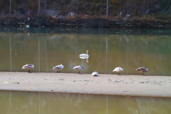 近日,白水江流域频传捷报:据去年首次在文县县城20公里的处的周家坝村库区发现2只野生白天鹅在这里越冬栖息后,村民向白水江保护局报告称,陆续又有成群的白天鹅飞临这里自由地遨游、觅食,构成如诗如画般美丽画卷,在此越冬的大天鹅由去年的2只逐步增加到今年的7只,且有进一步增加的迹象。