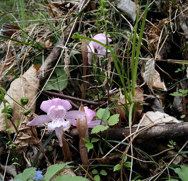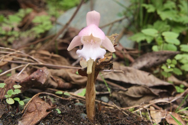 独花兰(学名:Changnienia amoena S. S. Chien):假鳞茎近椭圆形或宽卵球形,长1.5-2.5厘米,宽1-2厘米,肉质,近淡黄白色,有2节,被膜质鞘。叶1枚,宽卵状椭圆形至宽椭圆形,背面紫红色。花葶长10-17厘米,紫色,具2枚鞘;鞘膜质,下部抱茎;花大,白色而带肉红色或淡紫色晕,唇瓣有紫红色斑点;萼片长圆状披针形;花瓣狭倒卵状披针形,略斜歪,长2.5-3厘米,宽1.2-1.4厘米,先端钝,具7脉;唇瓣略短于花瓣,3裂。花期4月。独花兰因一叶一花而得名,生于疏林下腐殖质丰富的土壤上或沿山谷荫蔽的地方,具有很高的药用价值和观赏价值。