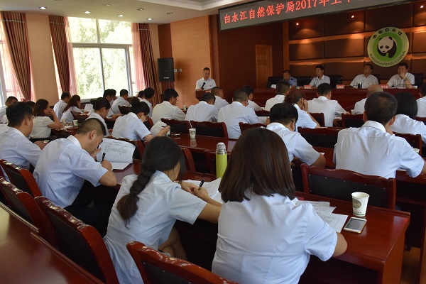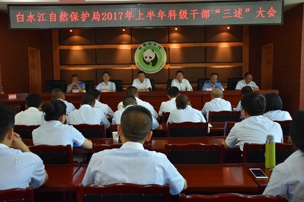 6月30日上午,白水江保护局在办公楼五楼会议室召开2017年上半年科级干部“三述”大会。会议由党委书记刘兴明主持。局领导班子成员、机关全体干部职工、各保护站(中心)正副科级干部共65人参加了会议。
