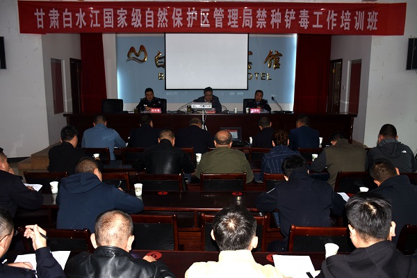 管理局党委委员、省森林公安局白水江分局政委高静春传达了《甘肃省禁毒工作领导责任考核办法》;管理局禁毒办主任、白水江分局副局长陈继安针对我国禁毒法律法规、天目行动及国际国内、省市和文县地区近年来的禁毒形势阐述加强保护区禁种铲毒工作的重要性、紧迫性;专业人员对野外摄影、GPS、地形图应用基础知识进行了专业培训;对禁种铲毒基础台账规范填写事宜作了说明。