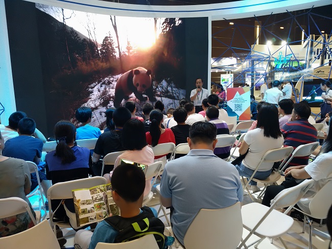 在中国世界生物圈保护区发展现状、研究成果会展上,工作人员向前来白水江世界生物圈保护区展馆参观交流的领导、专家、嘉宾和生物圈保护区同行介绍了白水江自然保护区野生大熊猫保护、生态资源保护、人与自然和谐共生等工作开展情况。